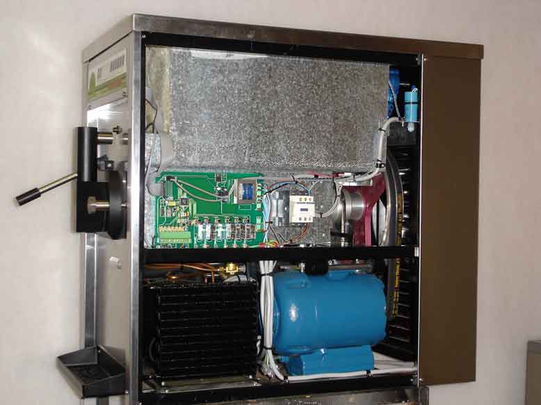 Two separate refrigeration systems combine to deliver ice cream and hold mix in the top tank at the optimum temperatures. A small top tank cooling system fitted inside the machine, keeps the top tank cool while a separate much larger system provides the freezing power needed to keep up with the high freeze rates achieved by the flooded barrel.
